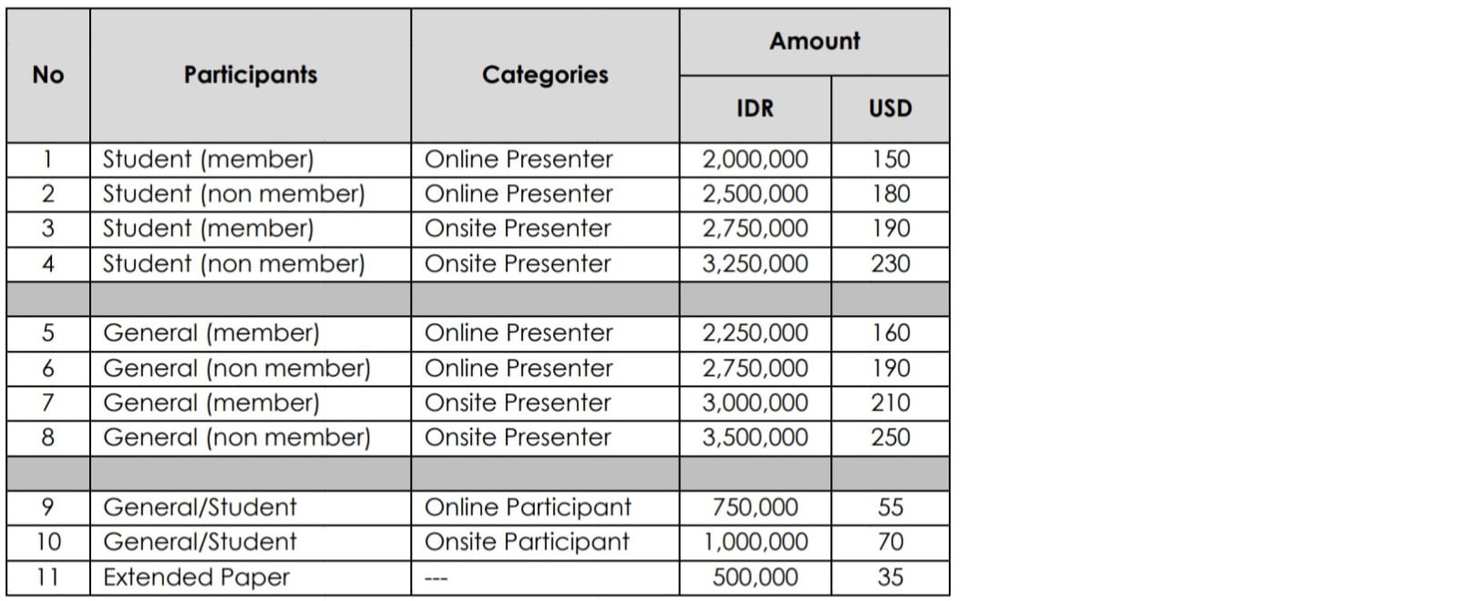 - IDR fees are only for participants with Indonesian affiliation(s), which are encouraged to attend the conference physically.